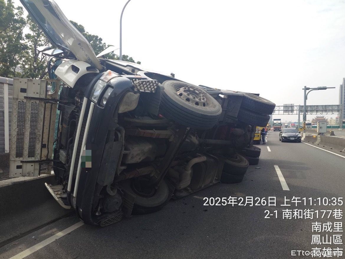 ▲貨櫃車翻覆倒在車道上,一度占用匝道出口。(圖/翻攝1986)