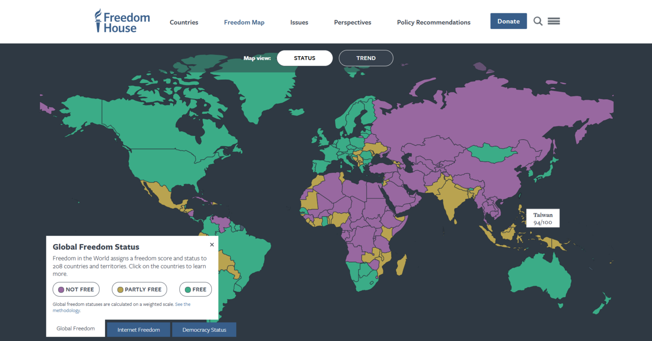 根據自由之家官網,自2000年以來,台灣充滿活力與競爭激烈的民主選舉制度,讓台灣得以定期實現和平的權力轉移,對公民自由的保護整體而言相當穩健。