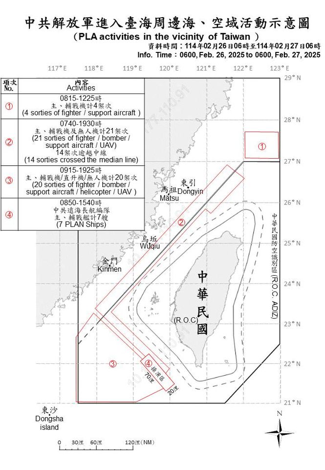 共軍昨實施「聯合戰備警巡」,並無視國際慣例,無預警於我西南海域,劃設臨時操演區,宣稱將進行「射擊訓練」。期間國軍運用任務機、艦及聯合情監偵手段嚴密監控,國防部今(27日)公布最新共機動態,自26日上午6時起至今上午6時止,偵獲共機45架次、共艦14艘、公務船1艘,持續在台海周邊活動。
