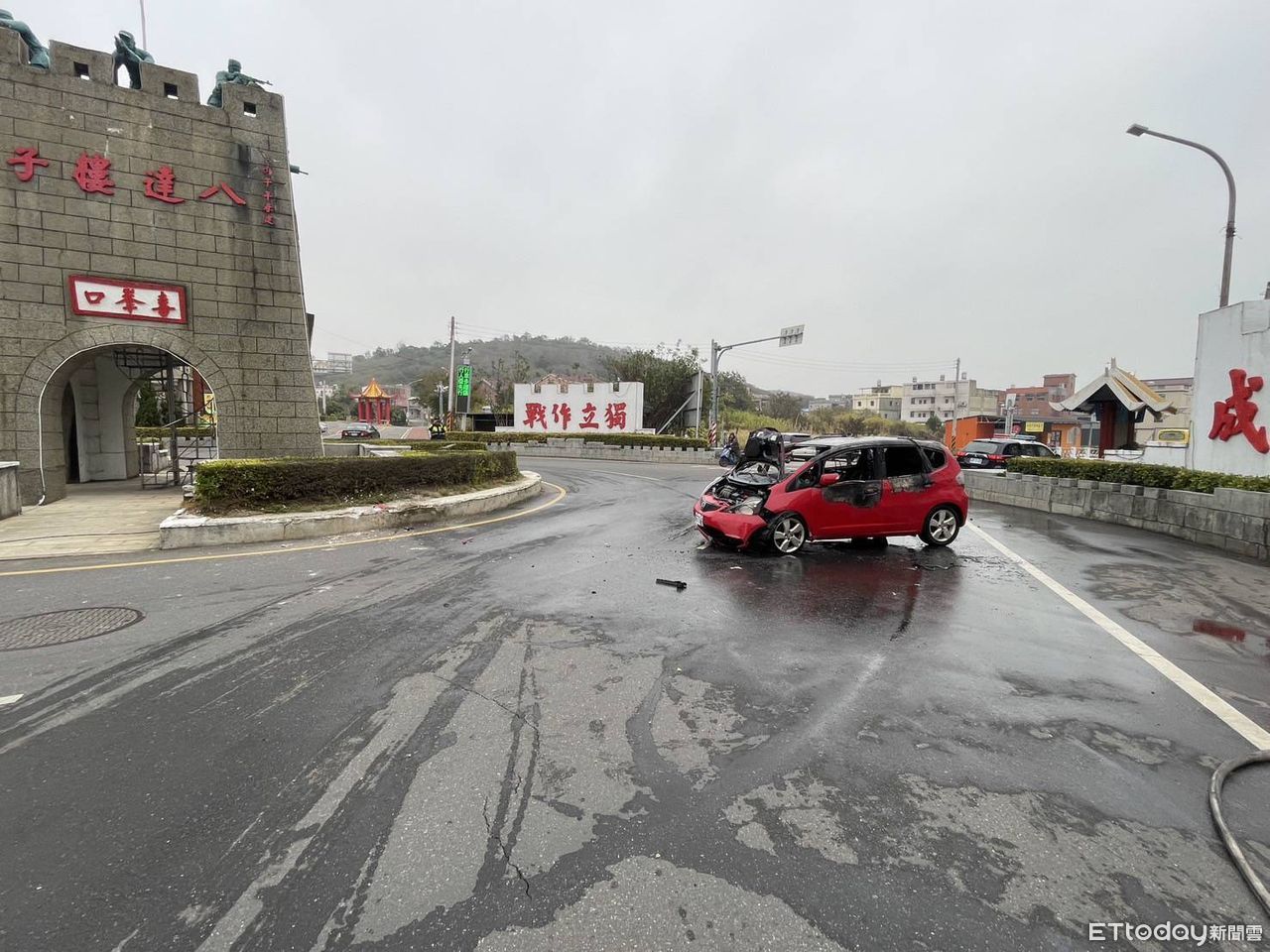 ▲金門轎車自撞八樓子圓環起火 。(圖/記者林名揚翻攝)