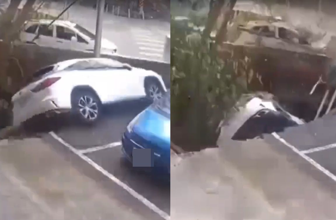 根據監視器畫面,事發時一輛白色休旅車停在車格內,不料一旁的花圃卻突然陷落,也導致休旅車一同掉入坑中,短短3秒的時間休旅車就消失在畫面中,取而代之的是一旁深不見底的龐大坑洞。