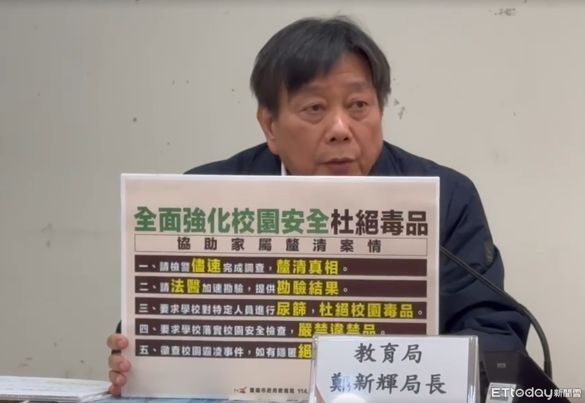 ▲台南市教育局長鄭新輝指出,教育局將全面強化校園安全,杜絕毒品,並與校方協助家屬釐清案情,並提5點聲明。(圖/記者林東良翻攝,下同)
