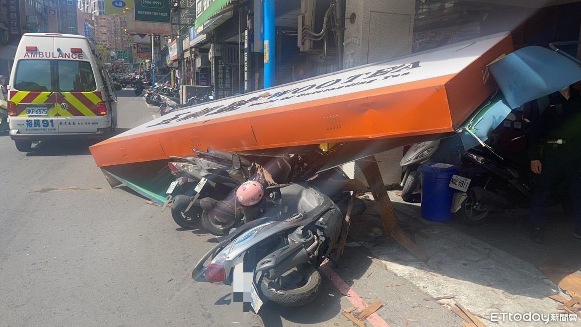 ▲新莊連鎖手搖飲店招牌掉落,砸傷1男波及6部機車。(圖/記者陸運陞翻攝)