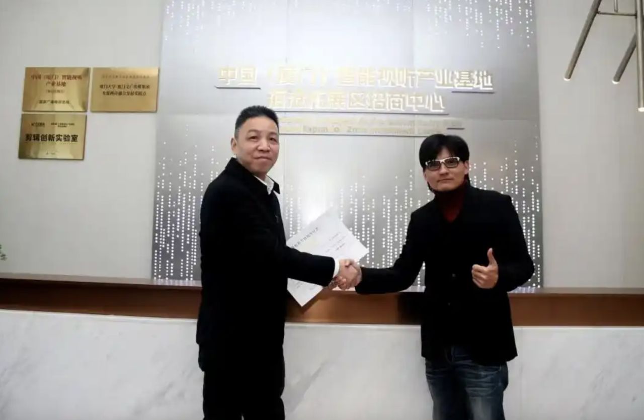 ▲「獨甪獸影視」創辦人江國銘(右)拿到許可證。(圖/翻攝廈門日報)