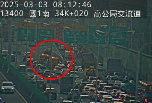 高公局表示,今天8時9分,國道1號北向33.6K、高公局交流道路段,發生2輛自小客車追撞占外線事故,請用路人小心駕駛。而該事故造成後方車流大回堵,目前該路段時速「紫爆」,僅剩18公里。