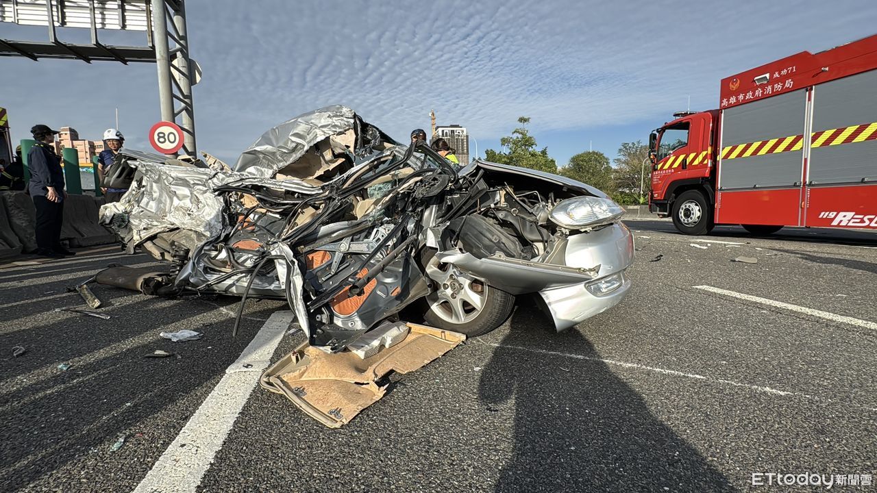 目前警方已趕抵現場處理,並釐清事故原因,現中山四路、漁港路匝道口封閉中,僅剩外側輔助車道可通行,後方車流回堵至少3公里。