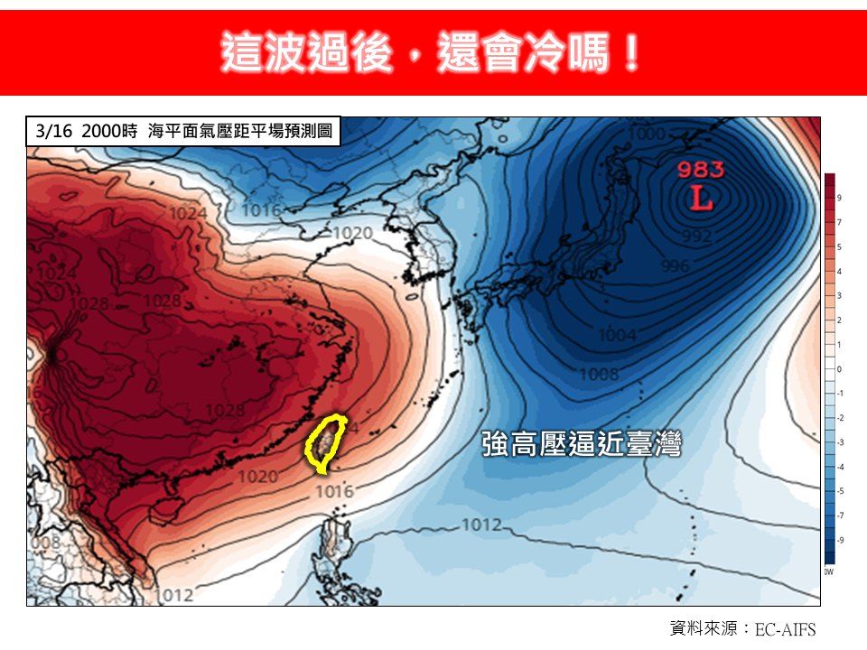 由今晨歐洲EC-AIFS數值模式最新模擬結果顯示,在本月中旬(3/15至3/17前後),還會有新一波強冷空氣會南下影響台灣,強度估計在強烈大陸冷氣團至寒流等級之間,比目前影響我們的這一波還要強。看來,冬厚衣要收,還需要再等等;不過,由於時間尚久,不確定性大,還可以再追蹤觀察後續的發展。