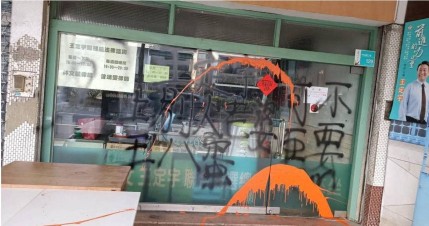 ▲葛斯齊透露2021年王定宇服務處遭人潑漆,當時鐵捲門上還留有「X人妻很爽嗎」6個大字。(圖/翻攝自Facebook/葛斯齊)