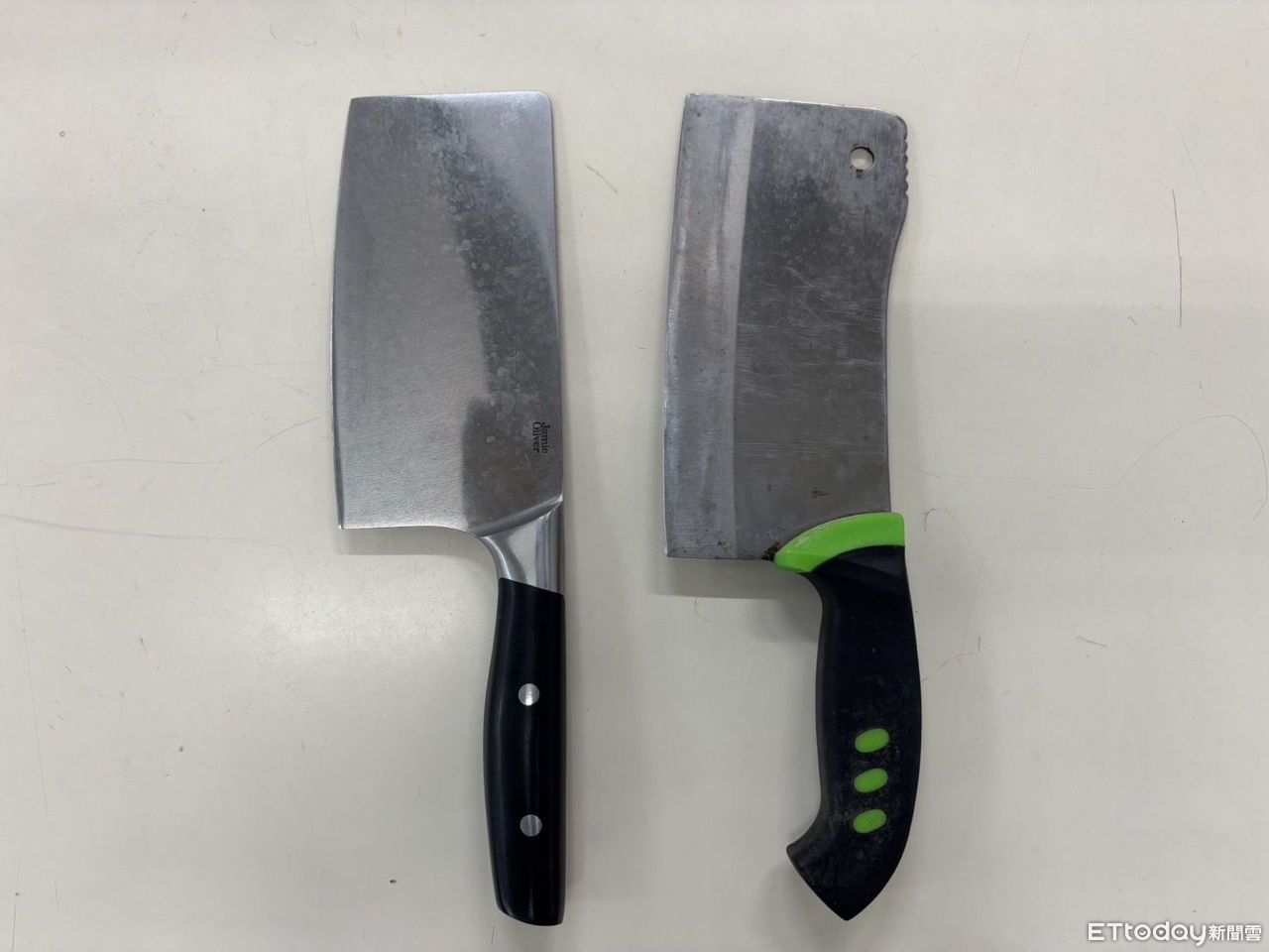 ▲警方查扣男子在馬路上叫囂所持的兩把菜刀。(圖/記者游芳男翻攝)