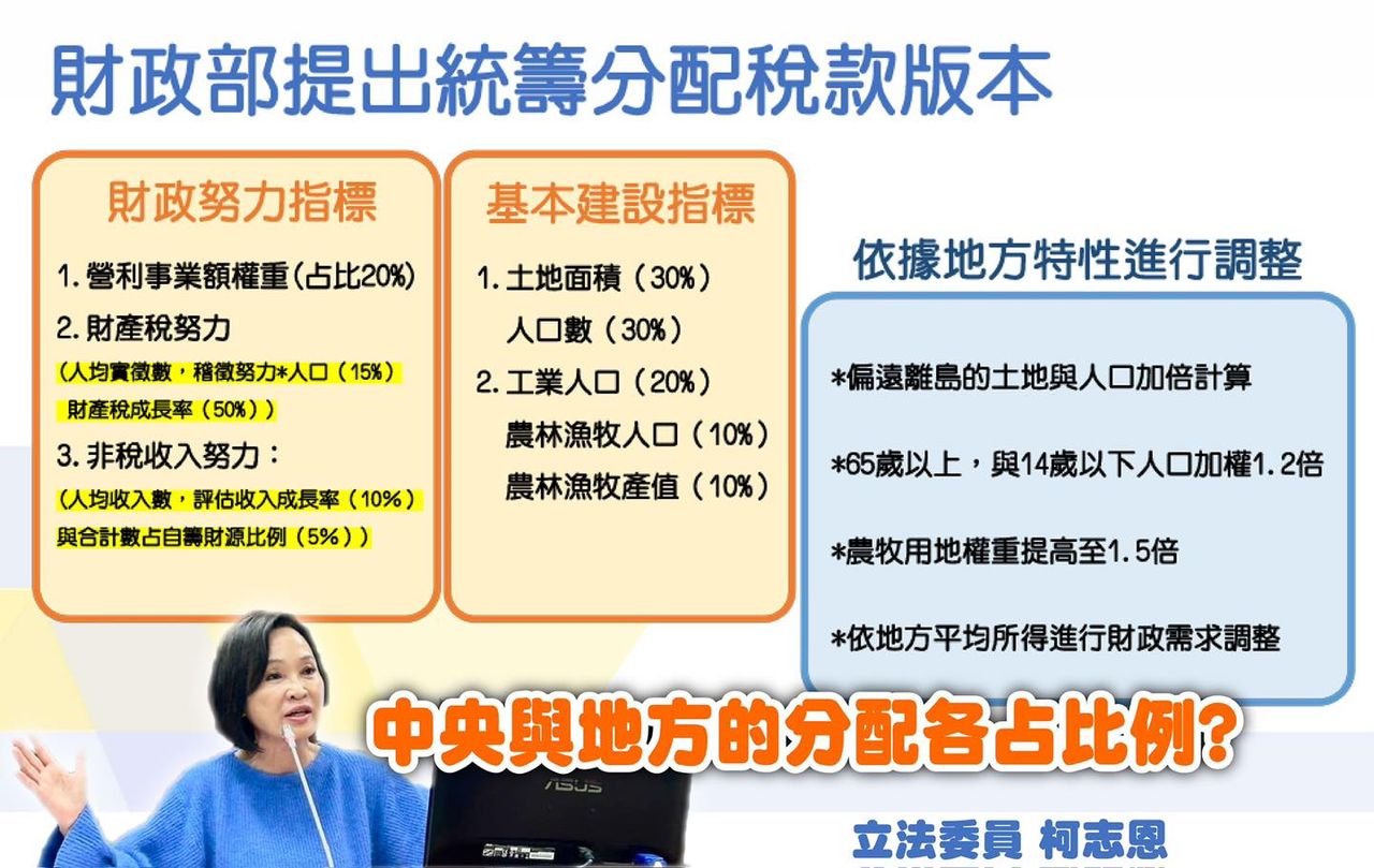 接著,柯志恩指出,自己不解,從去年12月20日財劃法三讀,迄今兩個月時間,就提出水平分配10大指標,敘明財源如何分配給各地方政府。財政部明明有能力提出方案,為何之前都「按兵不動」?