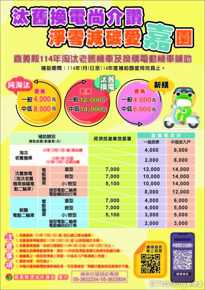 為鼓勵民眾換購電動機車,嘉義縣不僅補助淘汰老舊機車每輛2,000元起,如果同時換購電動機車,可加碼申請經濟部產業發展署補助,最多2萬1,000元,補助金額史上最高,經費用完為止。