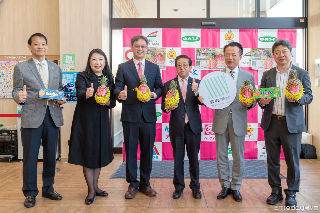 翁章梁、日本丸久超市田中康男社長、山口縣防府市池田豊市長、台農發股份有限公司唐淑華董事長、嘉義縣打貓果菜生產合作社陳映延理事主席及駐日代表處福岡辦事處洪育欽秘書,共同參見證嘉義優質農產再度進軍日本市場。