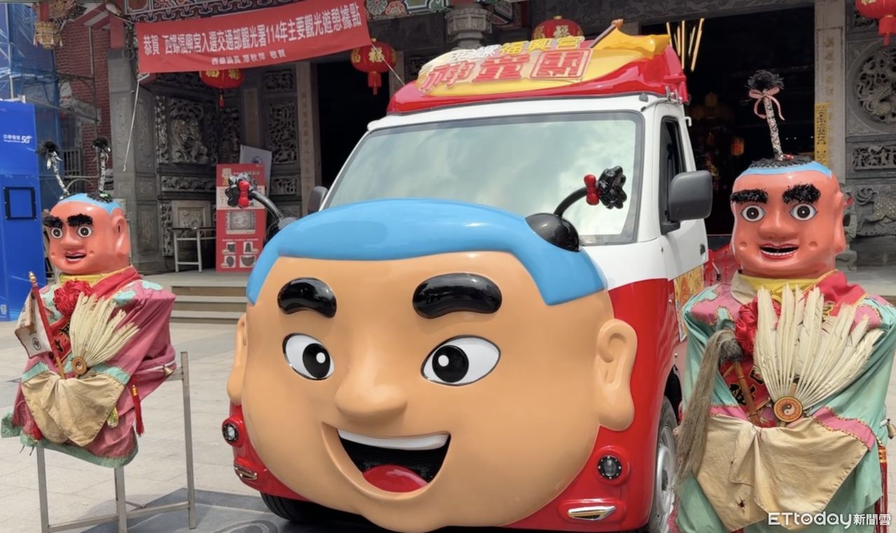 ▲西螺福興宮特地打造一輛超可愛的神童造型「神童車」,今日首度曝光,於廟埕舉行祈福儀式。(圖/記者游瓊華翻攝)
