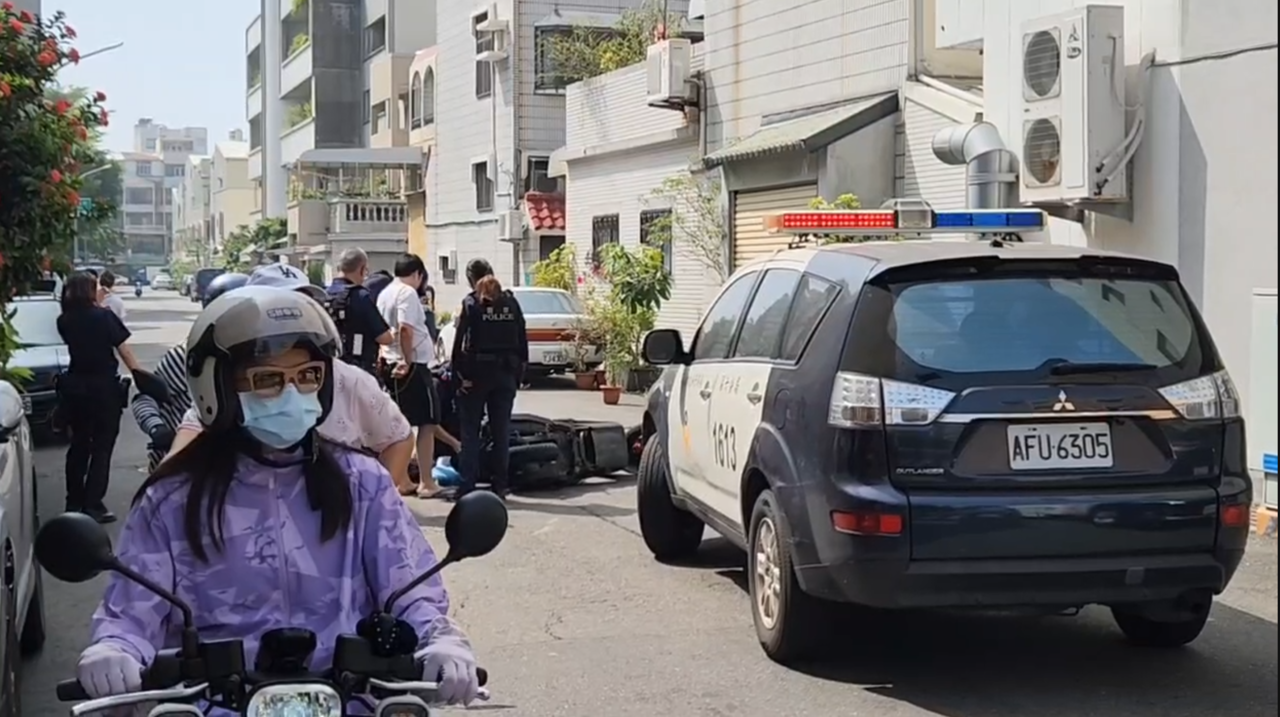 ▲郭男搶銀樓金項鍊騎機車脫逃時,自撞路旁汽機車摔車,被銀樓老闆、路人壓制,交由台南市警六分局員警帶回偵辦。(民眾提供,下同)