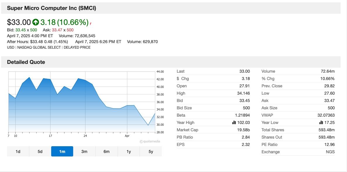 美國總統川普關稅政策引發全球股市震盪,但美超微電腦(Super Micro Computer,SMCI-US)週一(7日)股價卻逆勢上漲10.66%,每股最後以33.00美元作收,領先標普500指數。