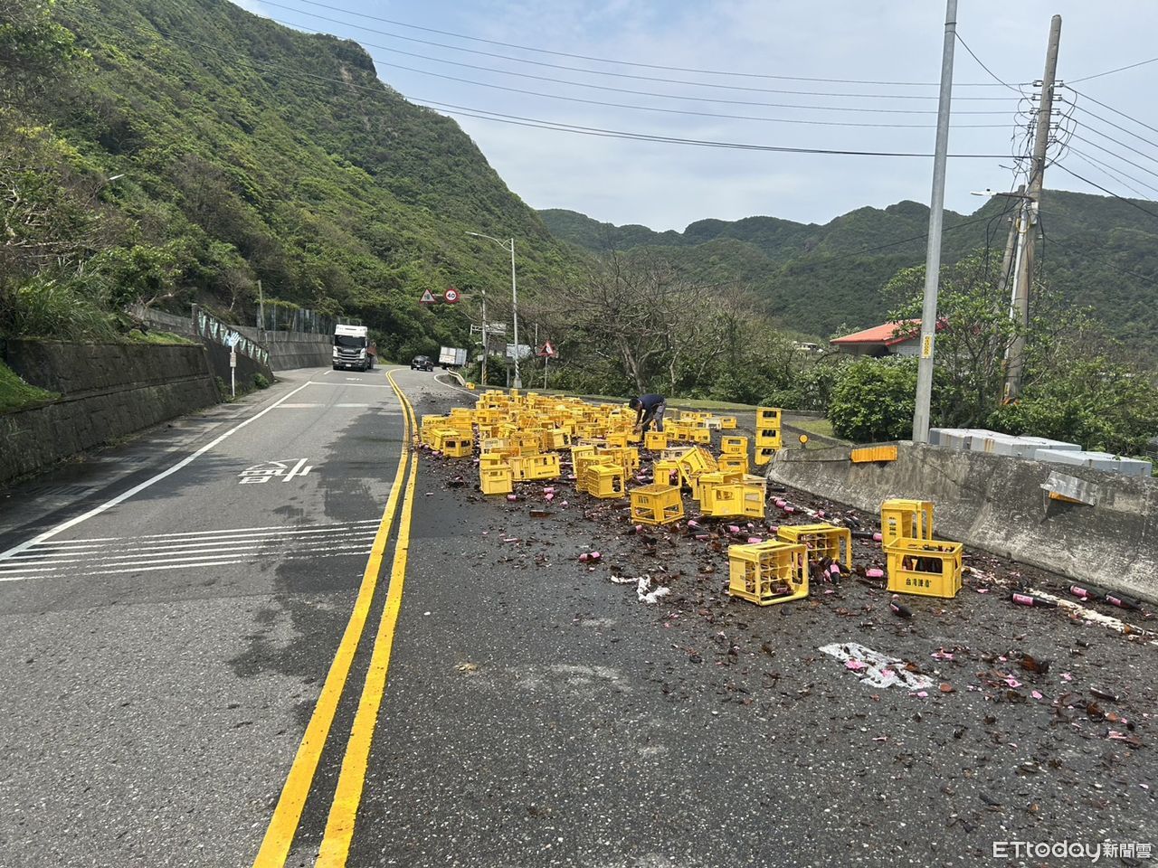 新北市貢寮區台2線86.2公里處、宜蘭往基隆方向今(8日)上午10時38分發生一起事故,27歲馬姓男子駕駛滿載箱裝米酒瓶的大貨車,因綑綁不實,行經該處時全翻落,滿地碎玻璃與米酒,佔據往基隆方向車道,目前由3名員警指揮管制單線雙向通行中。