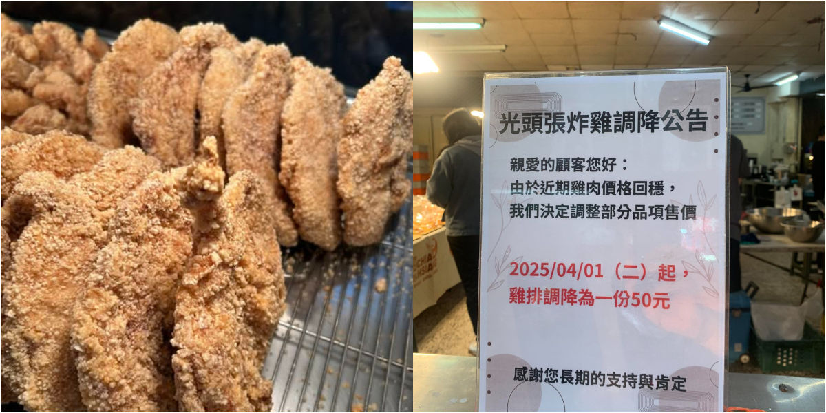 一名網友在公開社團《路上觀察學院》表示,他去買光頭張炸雞時,發現門口有擺放一個調降公告,上頭寫著「近期雞肉價格回穩,4月1日起雞排調降為一份50元」,這讓原PO一度不可置信驚呼,「街頭奇景!」