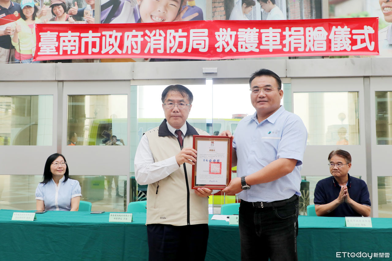 ▲海富建設股份有限公司捐贈台南市政府1輛救護車,9日在永華市政中心2樓廣場舉辦捐贈儀式,由市長黃偉哲代表受贈,並回贈感謝狀。(圖/記者林東良翻攝,下同)