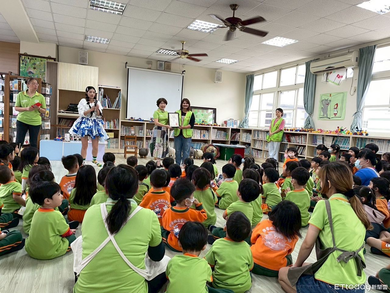 活動現場氣氛熱烈,主持人秀秀更穿上特製的「環保時尚裙」,這條裙子由尿布包裝袋手工縫製而成,不僅吸引孩子們目光,也成為活動中的亮點之一,讓在場師生驚呼連連。透過寓教於樂的方式,幼兒在遊戲與創作中理解資源再利用的價值,從小培養環保意識。