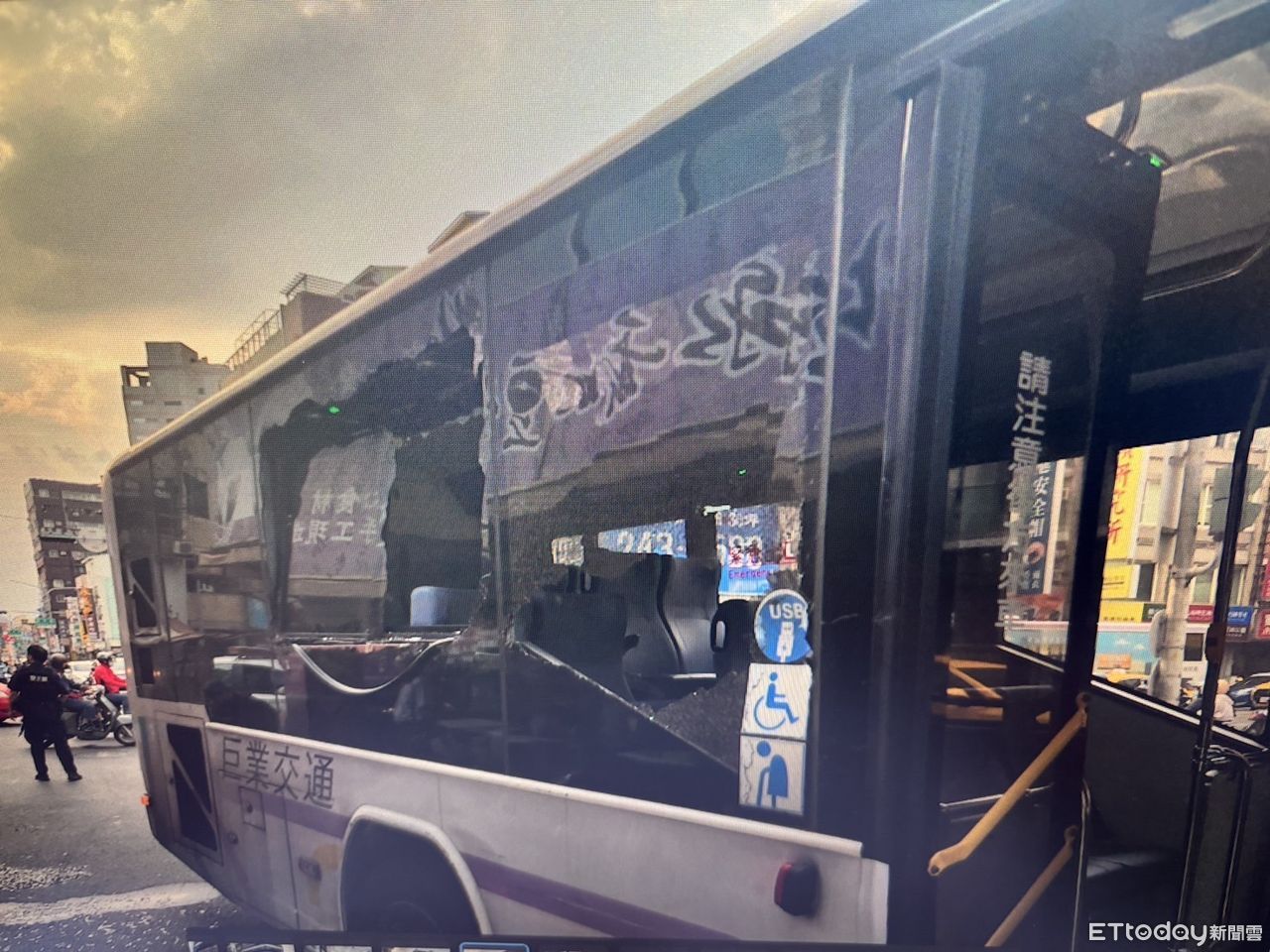 ▲台南公車擦撞路邊神像基座,2車窗破裂,造成一名乘客手指受傷。(圖/記者林東良翻攝)