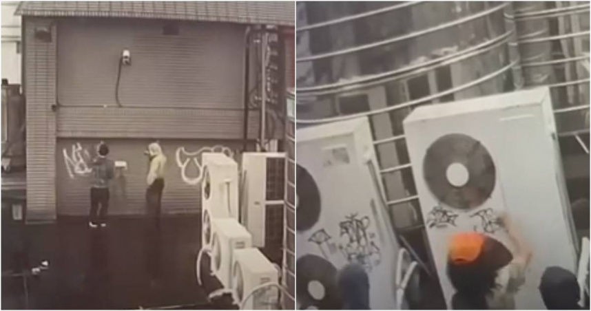 北市警大安分局敦化南路派出所日前接獲民眾報案,稱忠孝東路四段一處住宅大樓外牆、冷氣室外壓縮機等多處遭不明人士噴漆破壞。警方獲報後展開調查,迅速鎖定涉案人員,並在9日下午在西門町旅館查獲2名日籍男子池田、戶倉到案。