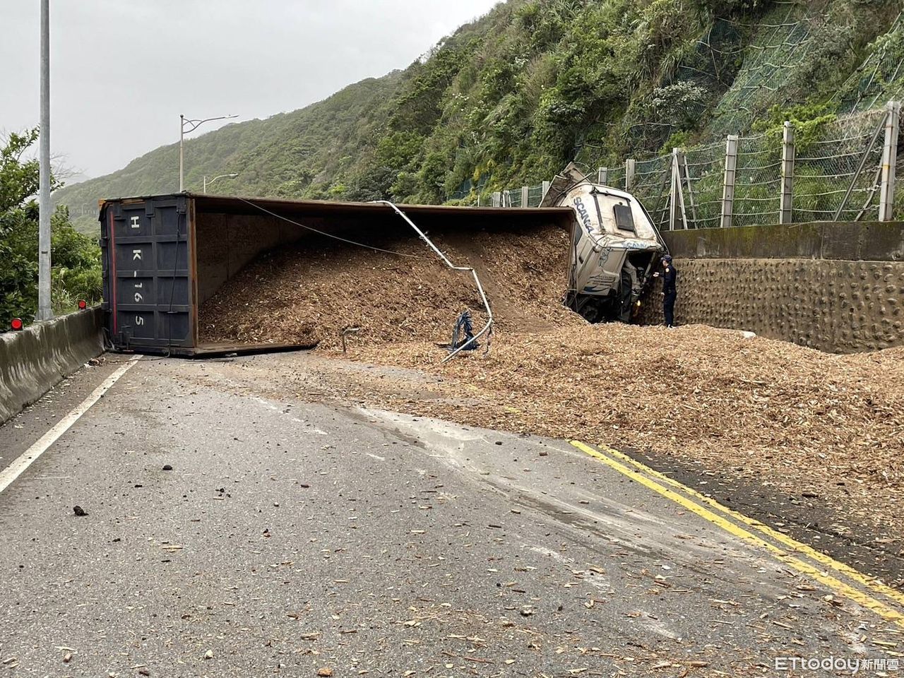 台2線約88公里處今(13日)上午發生一起嚴重事故,現場一輛砂石車不明原因失控翻覆,整輛車打橫的將道路全部堵死,車上滿載的木屑也全部散出,造成駕駛受傷,所幸並無大礙。警消獲報後立即趕赴現場,並通報相關單位前往搶通,至於詳細事發原因仍待調查釐清。
