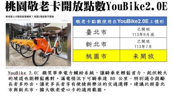此外,林政賢也關切敬老卡使用範圍,呼籲桃園市應比照雙北市,儘速開放敬老卡可使用於YouBike 2.0電輔車。政賢表示,敬老卡本為鼓勵長者增加外出活動與社會參與,YouBike本就屬於公共運輸,桃園不應落後其他直轄市。