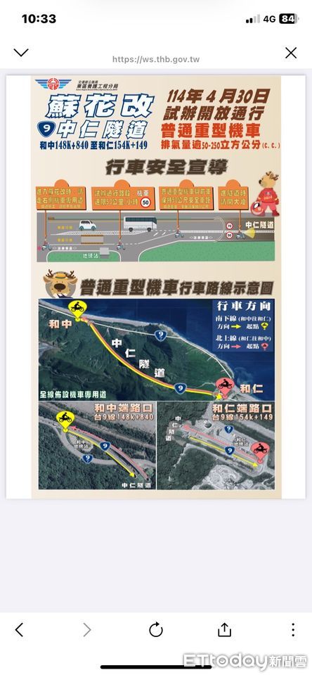公路局表示,「蘇花改中仁隧道開放普通重型機車試辦計畫」已奉交通部核定,訂自114年4月30日起開始試辦,考量初次於蘇花改長隧道通行普通重型機車,試辦初期機車專用道速限規劃為50公里/小時,待試辦檢核期後,將整體評估行車效率評估速限調整,請用路人依速限行駛。