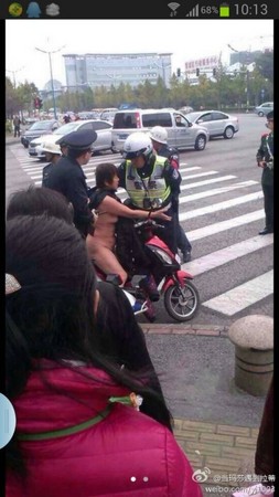 上海市青浦區外青松公路,12日早上發生一樁讓路人搖頭歎息的事件,一名騎電瓶車(台灣稱電動車)的女子違規,被交通警察攔下後,竟然撒野,瞬間脫光全身的衣物,一邊大喊「警察非禮」,一邊撕爛了警察的褲子。
