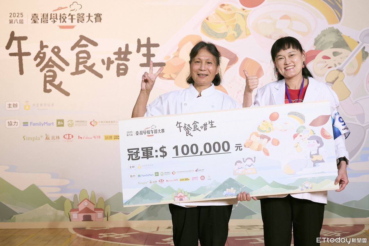 ▲台南市公誠國小營養師沈宜靜(右)與廚師陳金蓮(左)勇奪2025第八屆台灣學校午餐大賽全國冠軍,展現惜食創意與在地風味料理實力。(圖/記者林東良翻攝,下同)