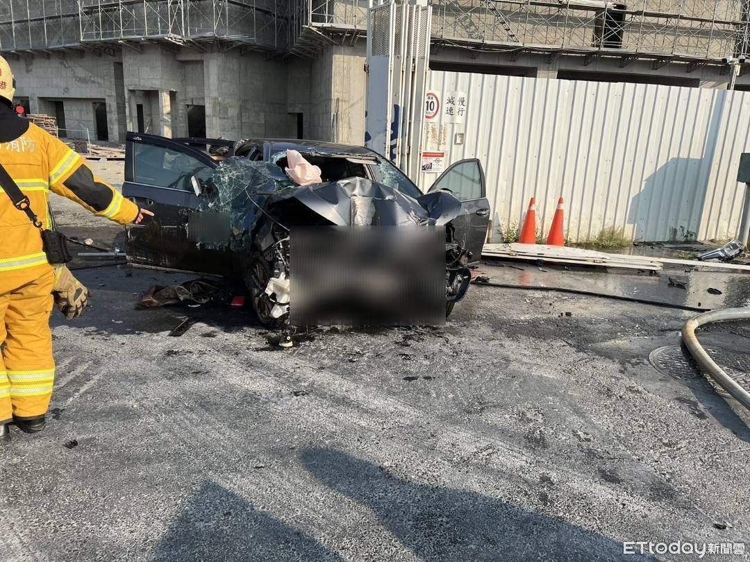▲案發當下,林男車輛一度起火,工地工作人員見狀趕緊灑水搶救。(圖/記者吳世龍翻攝)