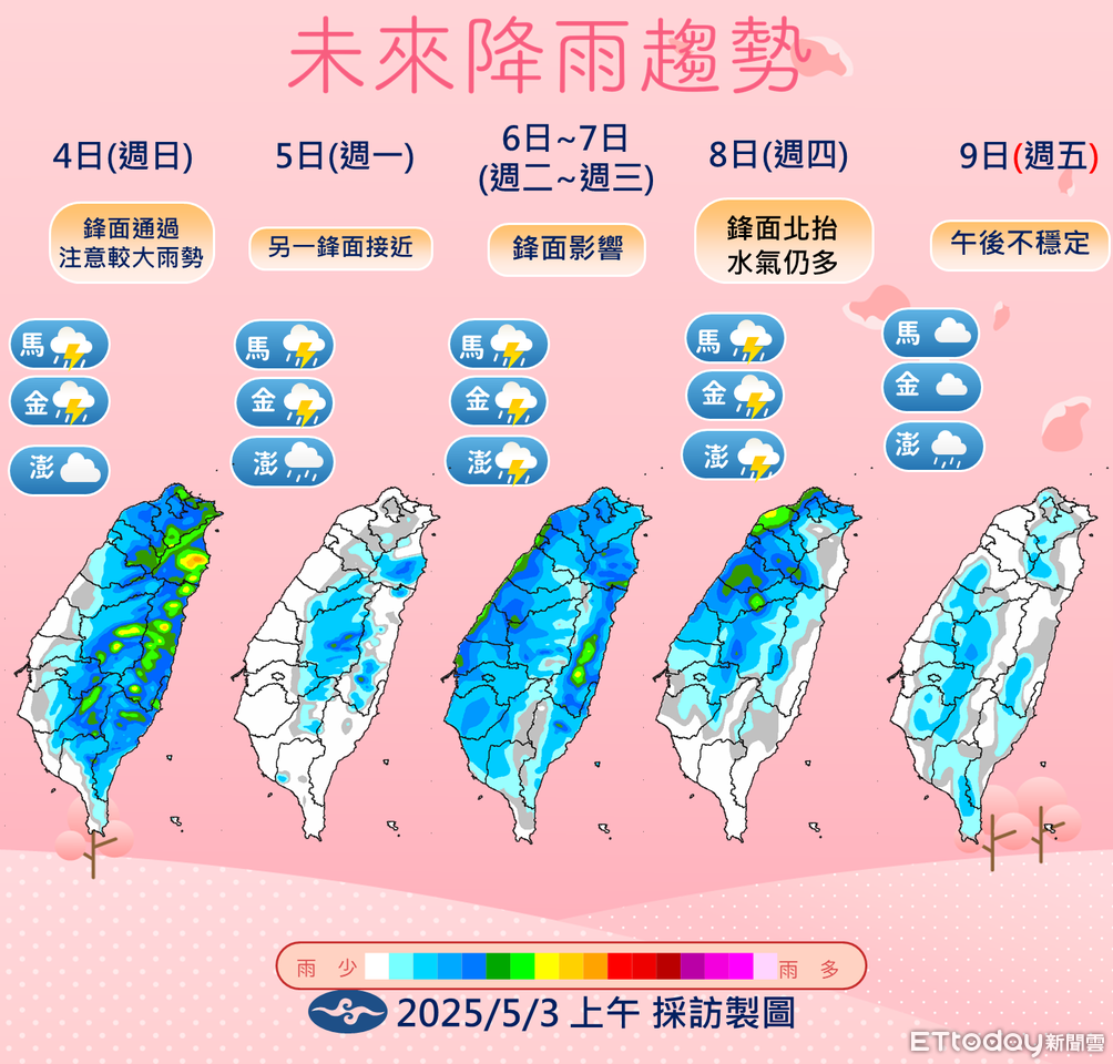 中央氣象署預報員林定宜表示,未來一周有2波鋒面經過台灣,皆為移動性鋒面,對台灣影響時間不長。今天午後熱力作用影響,降雨機率高,其中花東有較大雨勢機率。明天首波梅雨鋒面快速通過,各地有局部較大雨勢,雨區增加。下周一另一波鋒面生成接近台灣,周二、周三影響台灣,各地有局部短暫陣雨或雷雨。
