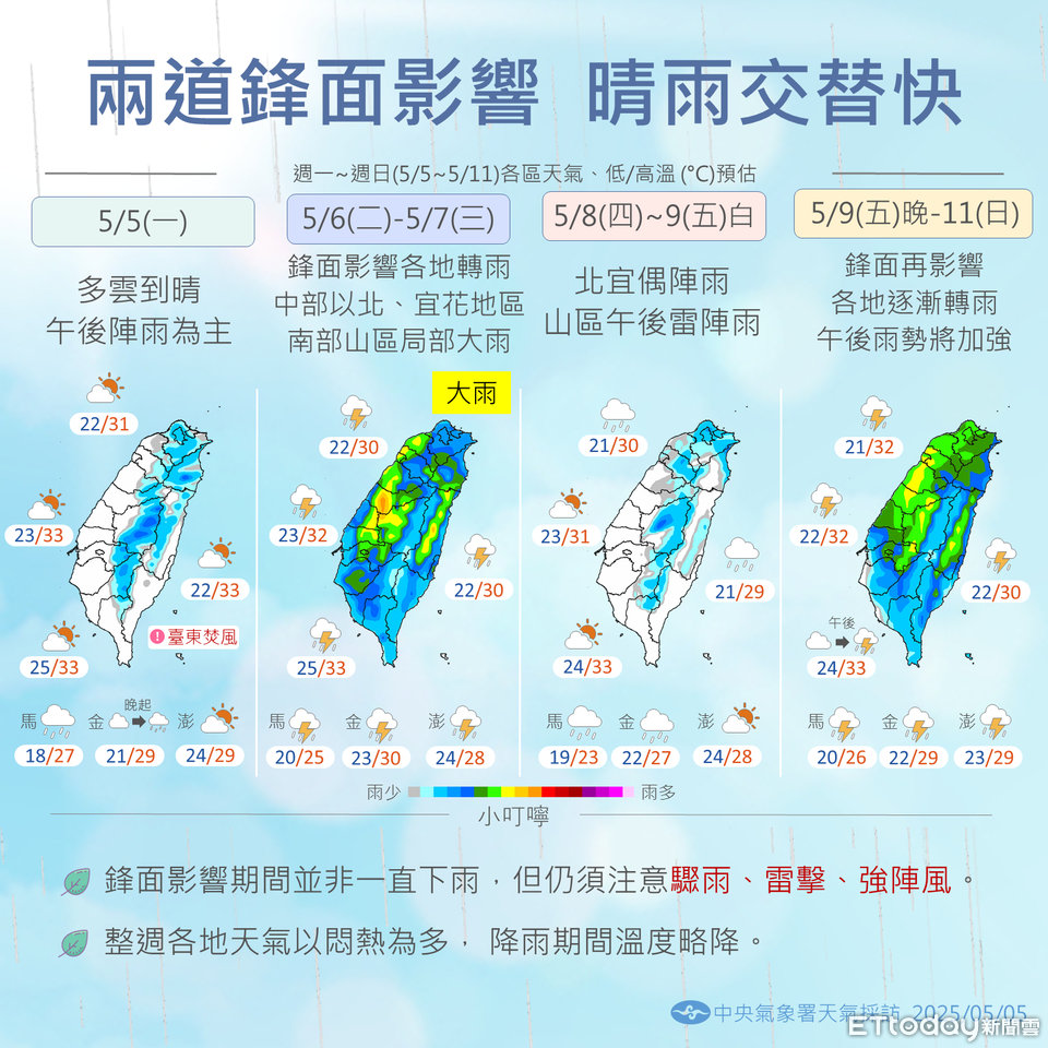 中央氣象署預報員林伯東表示,今天鋒面在華南地區逐漸東移,預計明天陸續影響台灣,周三受鋒面影響,天氣最不穩定,全台有雨,中部以北、宜花及南部山區要留意劇烈天氣。周四又有另一波鋒面在華南建立,預計周五晚間至周日影響台灣,屆時全台又會有明顯雨勢。另外,今天台東有焚風可能出現36度高溫,提醒民眾留意。
