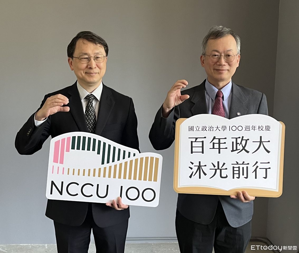 ▲政大2027年迎來百年校慶,校長李蔡彥(右)與副校長蔡維奇(左)說明百年識別設計,並啟動募集10億元薈萃基金。(圖/記者許敏溶攝)