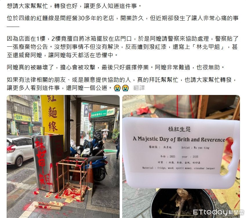 11日有網友在threads上發文表示,位於北市四維路經營30多年的老店紅麵線遭2樓住戶把冰箱擺在店門口,經營者阿嬤請警察協處,警方依規定貼上廢棄物清運公告,未料冰箱隔天遭潑上紅漆寫著「林北甲組」,對方還設立一個白色看板、仿效喪禮風格寫上「極紅生忌」二樓住戶更直接署名「藝術家:吳彥廷」,但吳男自以為有藝術風格的潑紅漆舉動,讓業者和鄰居生活在恐懼之中,甚至無奈停業影響生計。對此大安警方表示,7日約談被害業者到案釐清始末,8日約談二樓吳姓住戶到案,並依涉嫌恐嚇罪嫌將吳男函送北檢偵辦。