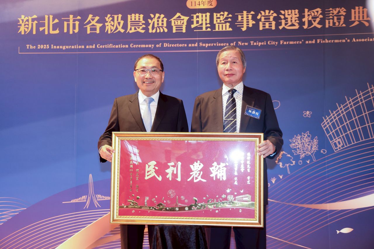 新北市農漁會完成114年度屆次改選,市長侯友宜今(12日)出席授證典禮,頒發當選證明書與賀匾予新任三首長及理監事,勉勵新團隊持續為農漁民打拚,攜手成為農漁民最堅強的後盾。