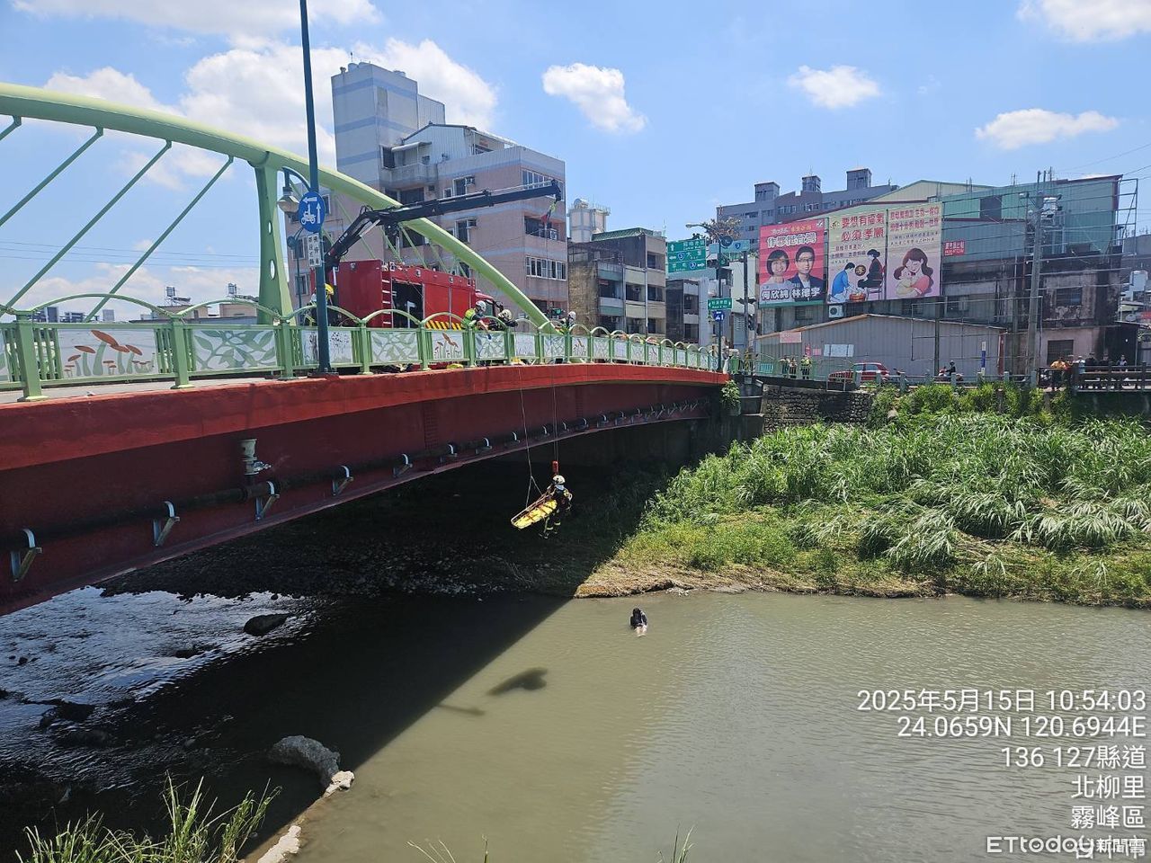 台中市霧峰區四德路中正路橋下溪水,上午10點33分驚見有一名女子坐在溪底,溪底距離橋上大約10公尺,警消獲報出動5車11人前往,11點08分,使用籃式擔架將傷患吊起移至安全處並做急救處置,該女左右膝蓋擦傷、意識清楚,送往亞大醫院救治,詳細有待釐清。