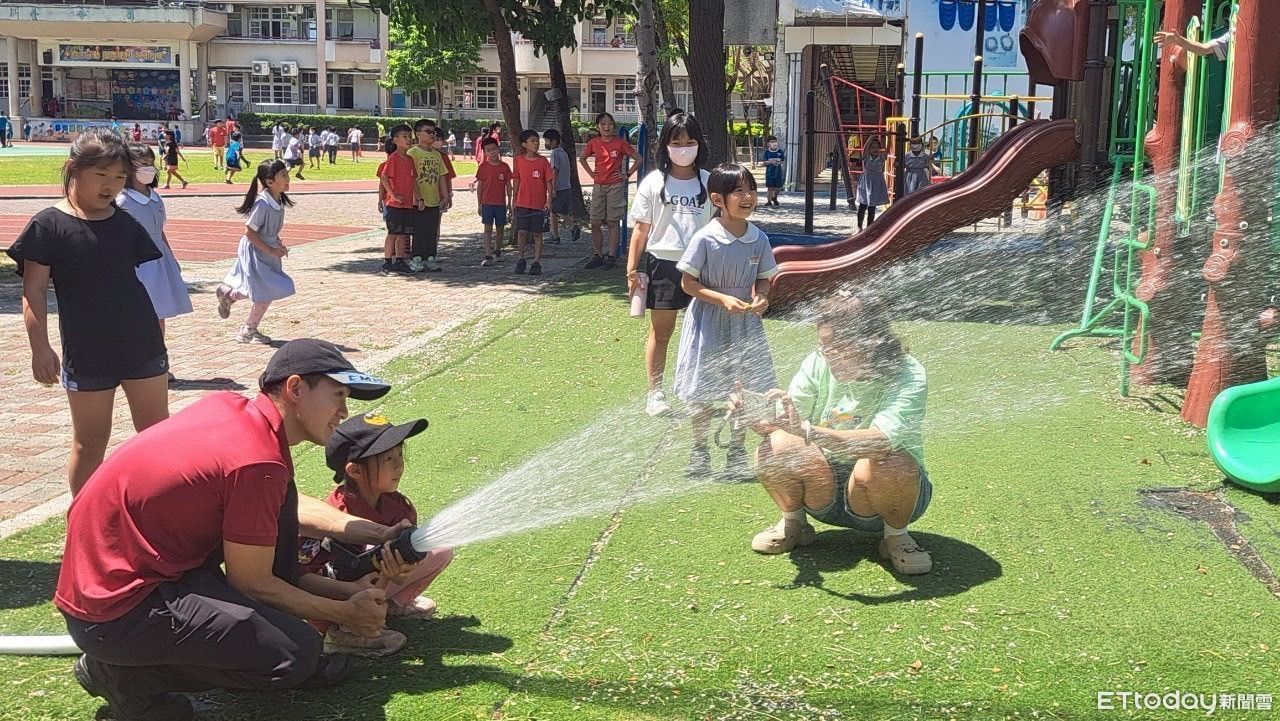 ▲台南市消防局鹽行分隊的消防貓「妙妙」身穿Q版消防衣現身校園宣導防災,小朋友搶著互動學知識,氣氛熱烈溫馨。(記者林東良翻攝,下同)