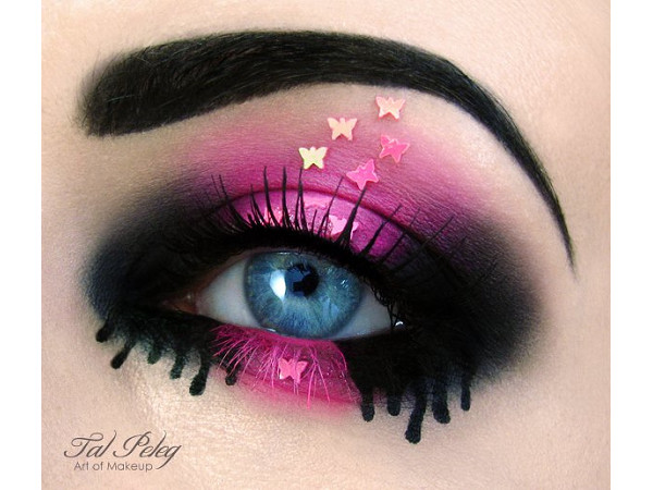 將鮮豔的桃紅色與反差黑色佈滿在眼睛四周,加上蝴蝶亮片的點綴,誇張卻也不失美麗。