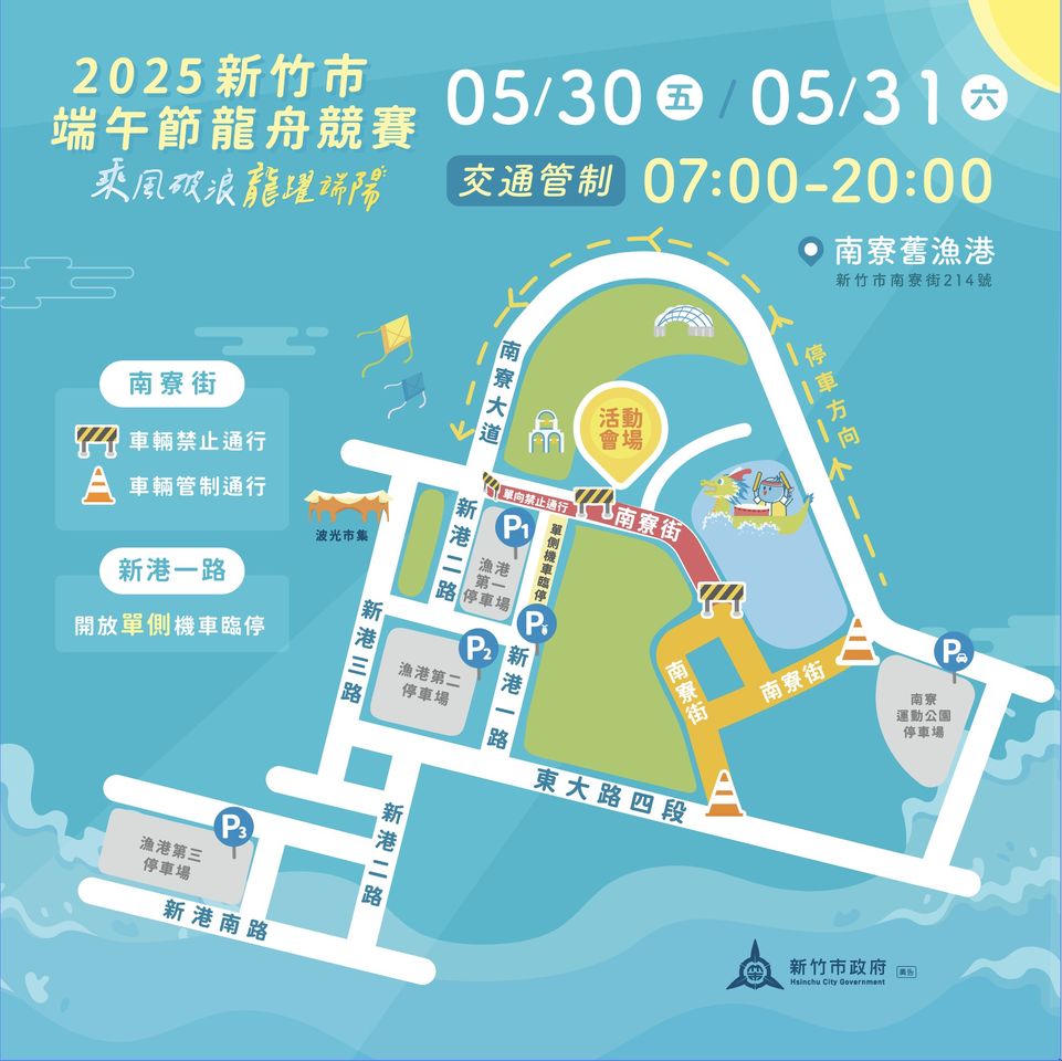城銷處提醒,為維護活動安全,5月30日至31日每日7時至20時,南寮街將實施交通管制,新港一路則開放單側機車臨停,請市民配合現場交管人員指引,提早規劃行程,安全參與活動。邀請大家攜家帶眷前來南寮漁港,一起為選手加油打氣,在海風與鼓聲交織中,留下難忘的端午回憶。