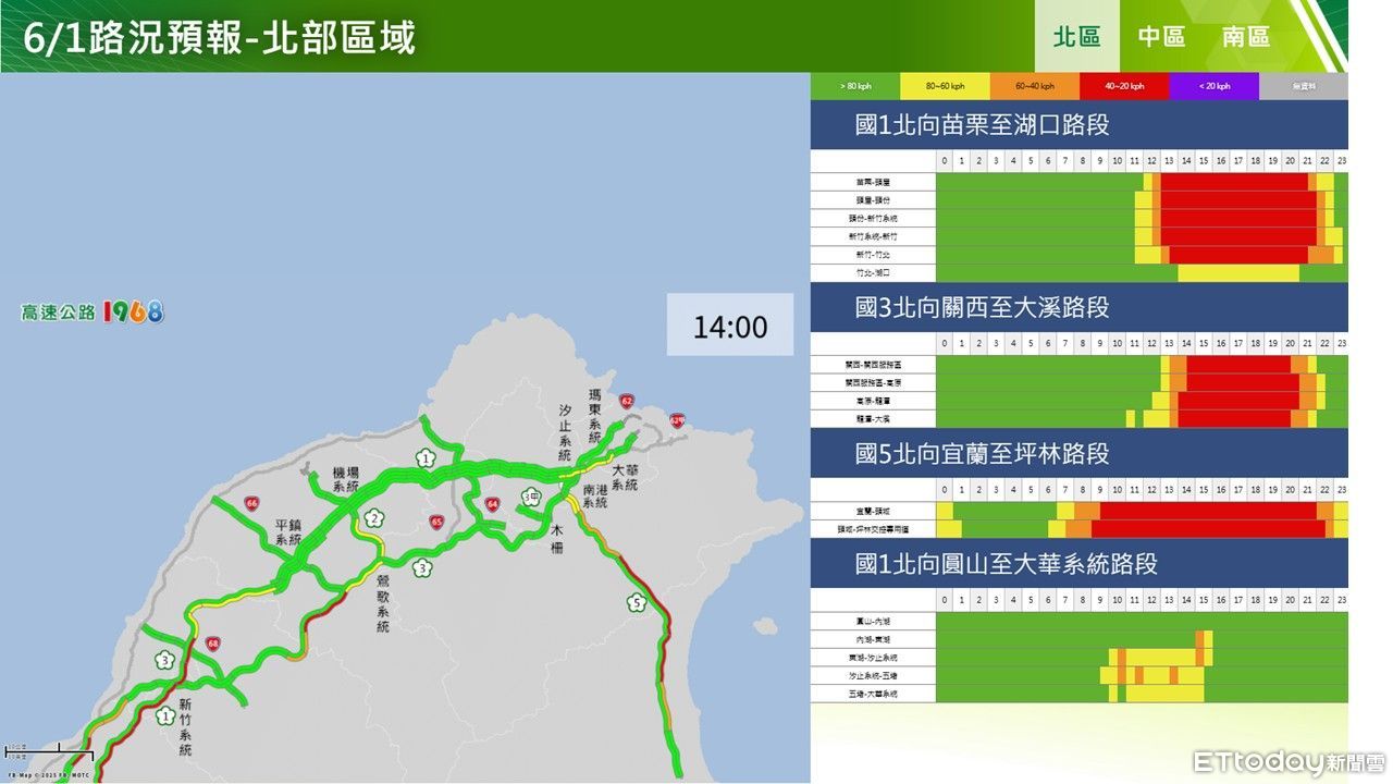 高公局預判,今天下午重點壅塞路段為國1北向西螺-埔鹽系統、南屯-后里、苗栗-湖口;國3北向竹山-中興、草屯-霧峰、大山-香山、關西-大溪;國5北向宜蘭-坪林;國4西向潭子系統-豐勢;國6西向舊正-霧峰系統;國10西向仁武-左營端等路段。