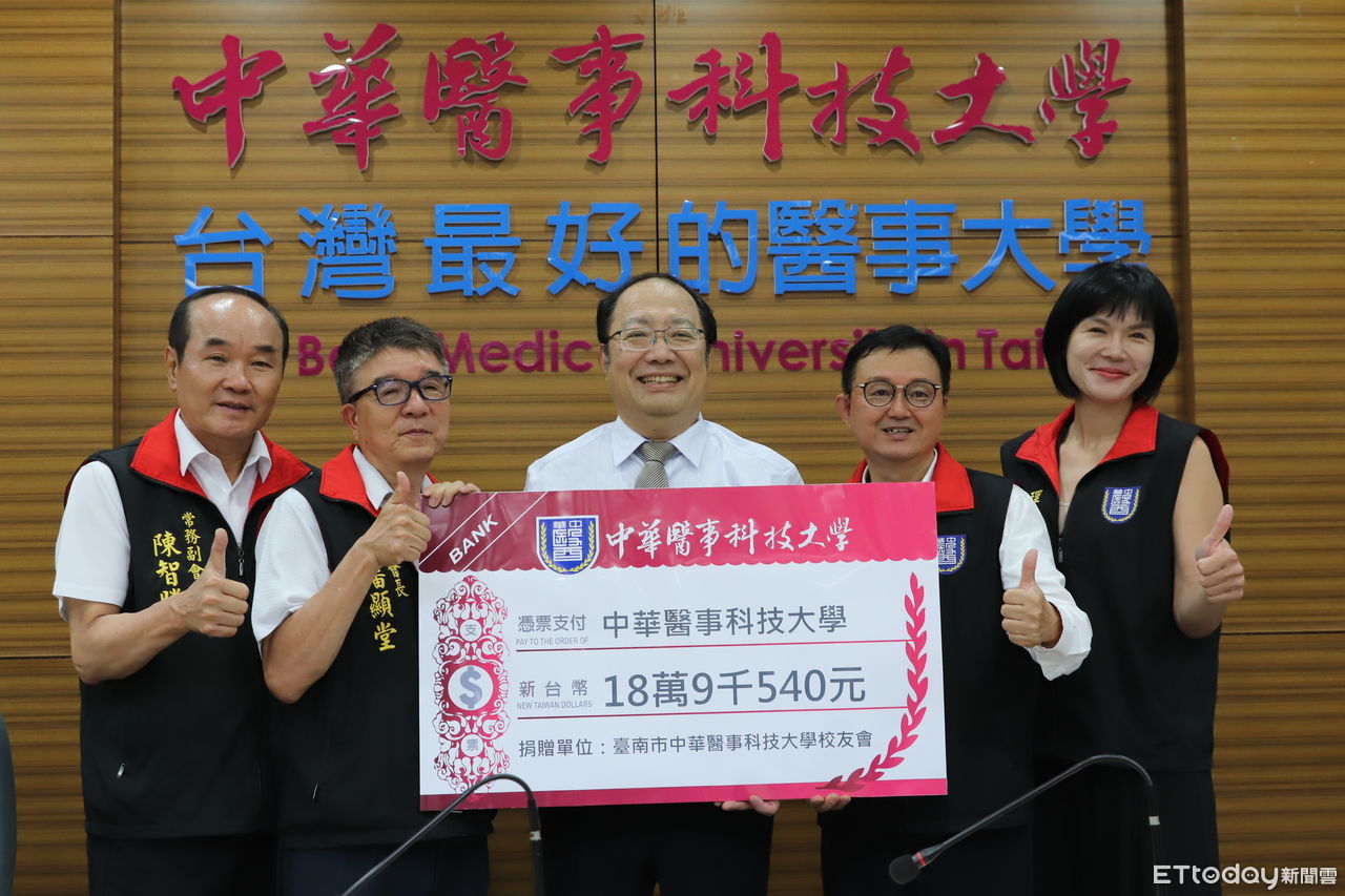 ▲中華醫大傑出校友高皓珉(右一)返校捐贈紅棗脆片義賣所得18萬9540元,由校長孫逸民代表受贈,盼扶助弱勢家庭學生。(記者林東良翻攝,下同)