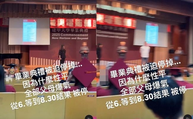 該系畢業生「@Jacob Chong」在Threads上發文表示,「我無語了,逢甲!我爸特地來,結果畢業典禮被迫停掉」,他們從晚上6時等到8時30分,最後還是被迫停掉,「因為什麼性平,全部父母爆氣!」他也直呼,這是人生最難忘的畢典了,謝謝逢甲。