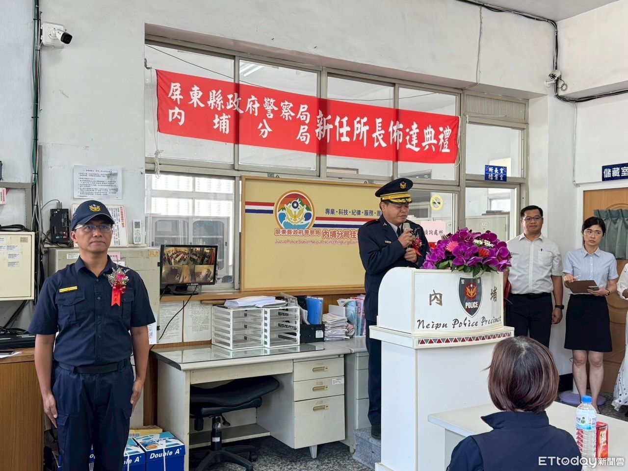 屏東縣政府警察局內埔分局於本(6)月9日上午10時舉辦新任所長聯合布達典禮,由分局長郭譯隆親自主持,並邀請屏東縣議員李世淦、萬巒鄉民代表主席潘進丁、及內埔警友辦事處幹事張均邑等20多名地方人士與會,場面簡單隆重。