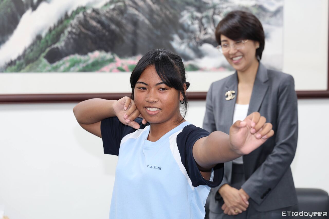 目前就讀旭光高中國中部8年級的田萱,9日下午由旭光高中校長何光明及教練陳文靜陪同到縣府,與縣長許淑華相見歡;許淑華除給予溫暖擁抱,也贈送一個「文青背包」,田萱則徒手示範教導許淑華如何正確拉弓。