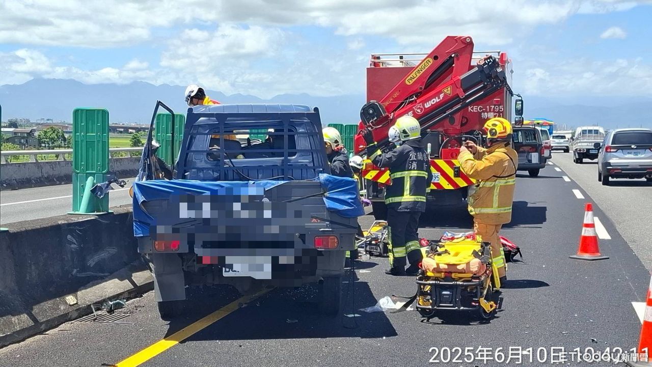 國道警指出,10時10許接獲通報,國5南向31.6公里,路肩工程車遭小貨車撞擊,小貨車佔用內側車道,巡邏車到場查看,小貨車29歲男駕駛受困車內、呼叫無回應,肇事原因待釐清,10時30分許救護人員現場判定無呼吸心跳,10時45分將人員救出送陽大醫院搶救。