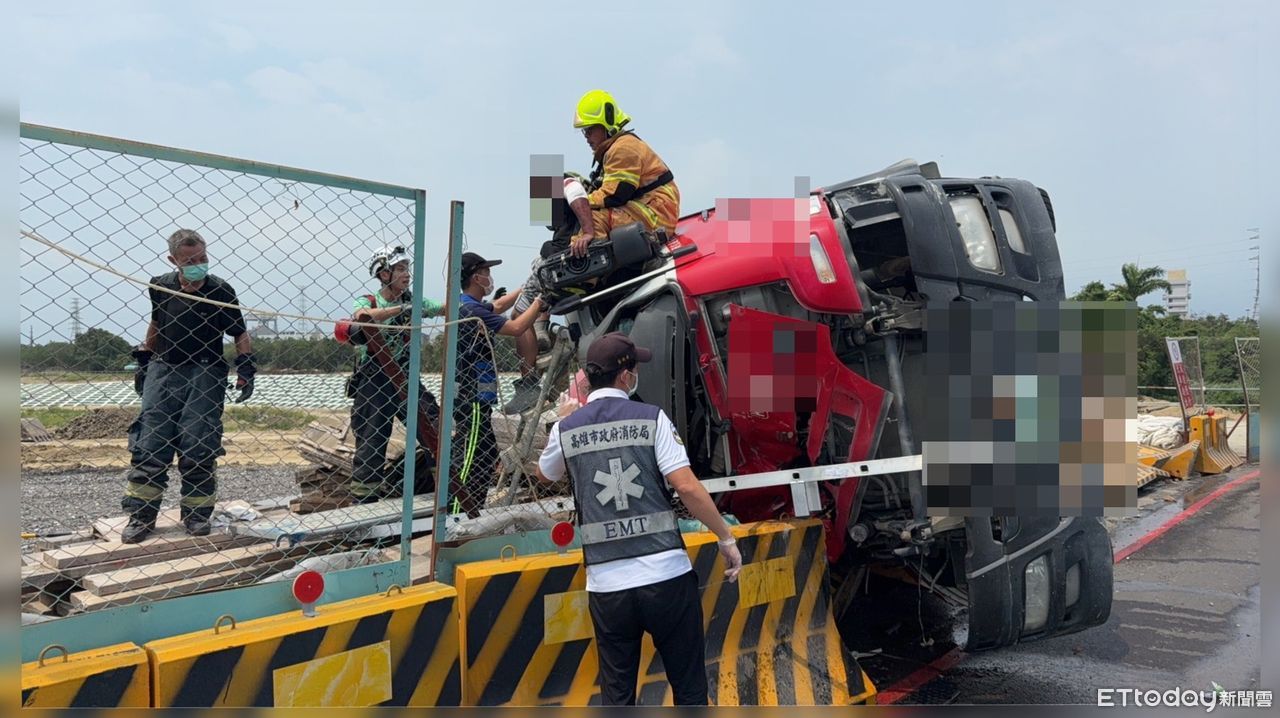 今天(11日)下午1時許,高雄市燕巢區高鐵總廠路段發生一起翻車事故。一輛混凝土車行經該路段轉彎處時,不慎擦撞路旁的L型護欄,導致車身傾覆,司機一度受困車內。
