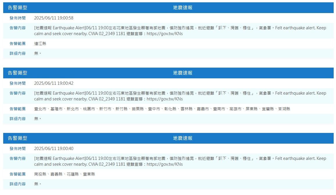 根據氣象署測報資料,震度4級地區為花蓮縣、南投縣、嘉義縣、雲林縣、台中市、彰化縣、苗栗縣,震度3級地區為高雄市、宜蘭縣、台南市、嘉義市、屏東縣、新竹縣、桃園市、新北市、台北市,震度2級地區為新竹市、基隆市、澎湖縣。