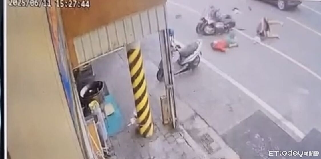 ▲21歲騎士遭鬼切婦亂穿馬路擊落,2人「噴飛翻滾」。(圖/記者賴文萱翻攝)
