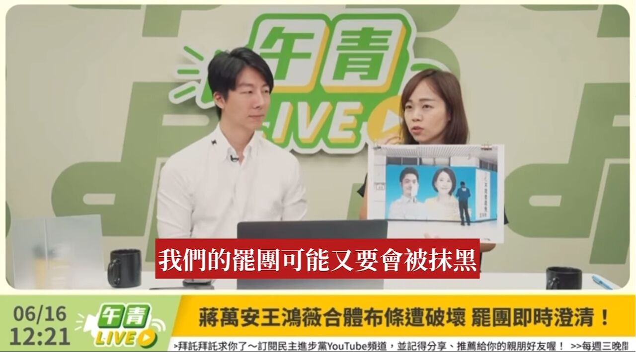 王鴻薇今日上午在臉書指控,她於民權東路吉林路路口1樓的看板,涉嫌被罷團、青鳥、側翼破壞,而這也是她的看板第2次遭破壞。辦公室第一時間已報案,經警方勘驗畫面後,也鎖定嫌犯為1男1女,以異物用刺破的方式對看板上的台北市長蔣萬安面部部分攻擊破壞,隨後離去。她強調,「對於任何犯罪行為,我們絕不姑息,一定追究到底」。